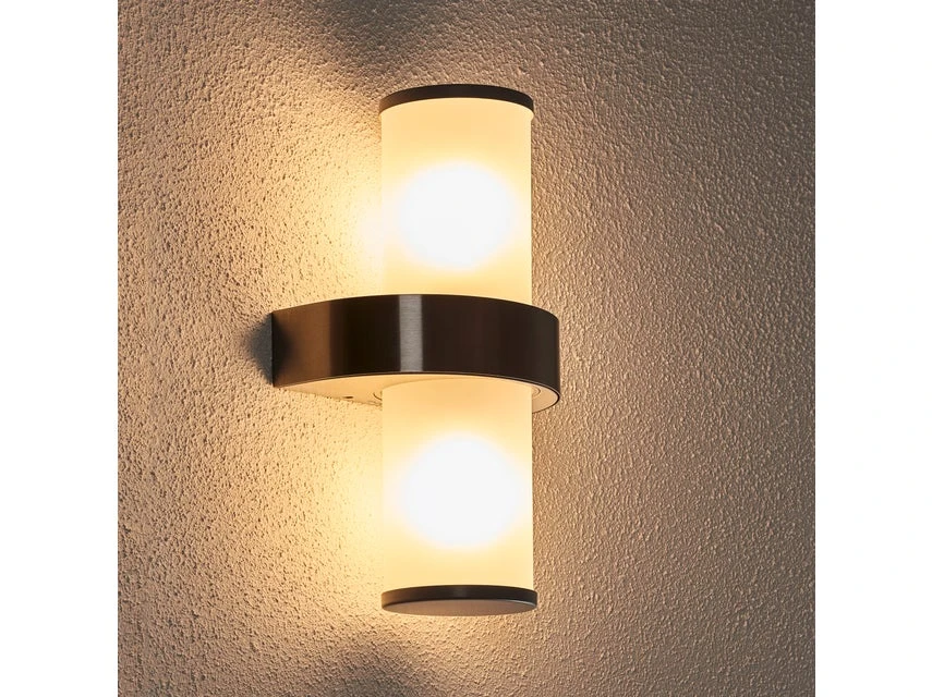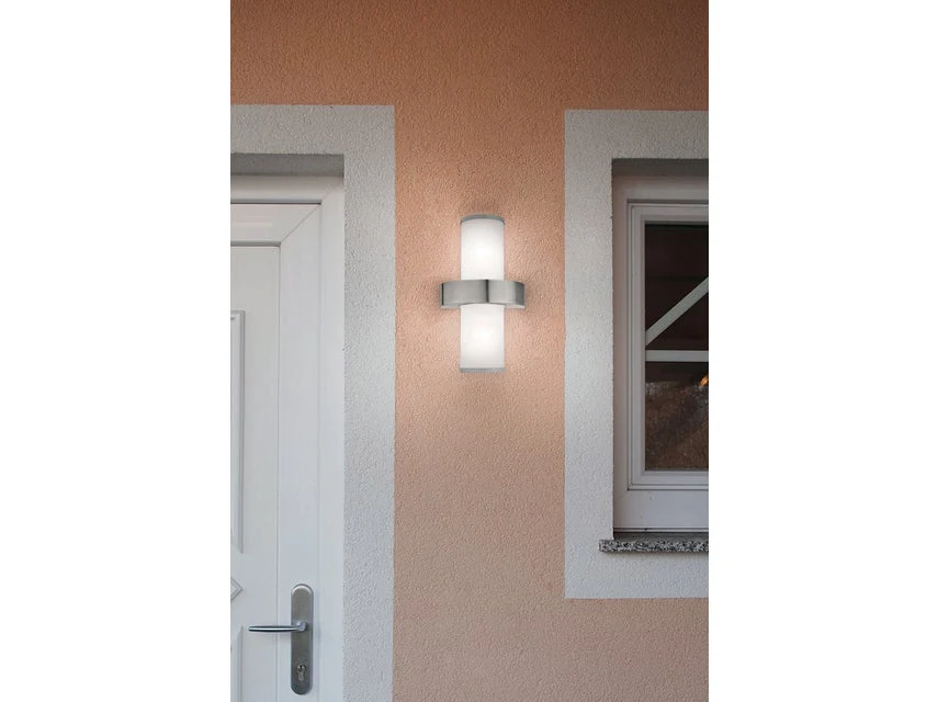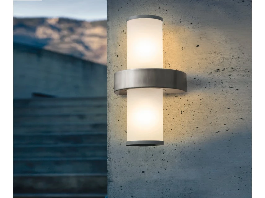 Geschmackvoll schlicht ist die moderne Außenwandleuchte Beverly. Der Zylinder besteht aus satiniertem Glas und wird zuverlässig und elegant von einem glänzenden Edelstahlring gehalten. Mit ihrem modernen Flair erhellt Beverly nicht nur den Eingangsbereich, sie ist auch eine perfekte Visitenkarte für Ihr Zuhause. Die Leuchte ist spritzwassergeschützt mit der Schutzart IP44, etwa 35 cm hoch und benötigt zwei E27-Leuchtmittel.