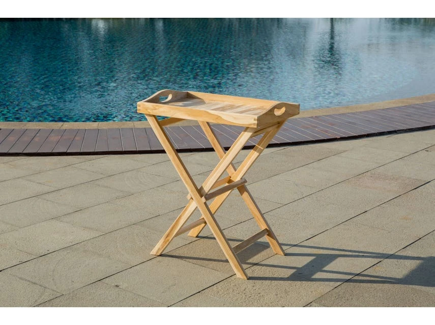 Schön und nützlich ist der hübsche Serviertisch aus edlem Teakholz der Marke Coraggio Forma. Er besitzt ein abnehmbares Tablett, ist klappbar, leicht transportabel und vielseitig einsetzbar, indoor und outdoor. Ein Highlight ist das hochwertige Material: Das Tischchen besteht aus geschliffenem, unbehandeltem Teak und ist komplett naturbelassen. Im normalen Alterungsprozess vergraut die Oberfläche mit der Zeit, Abhilfe schafft die Pflege mit Teaköl.