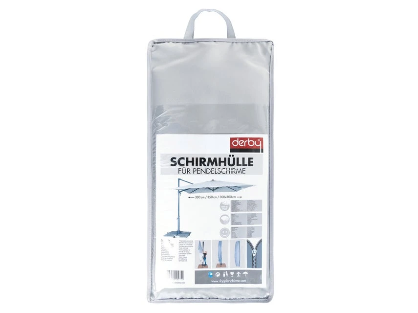 Diese Schutzhülle für Pendelschirme bis Durchmesser 300 cm oder 300×300 cm ist inkl. Reißverschluss und Stab.
