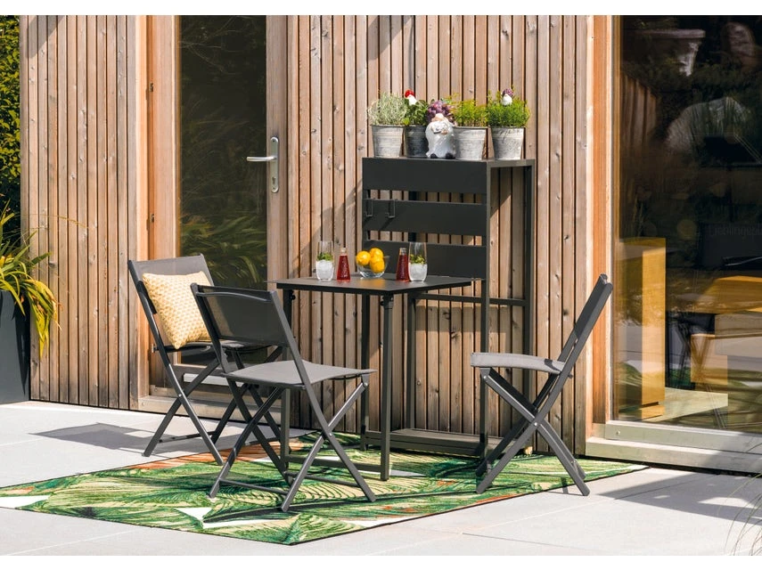 Das Balkonmöbel-Set Modena ist ein echtes Platzsparwunder für jeden Balkon! Zum Set gehören drei Klappsessel (je 46 x 80 x 50 cm, Sitzhöhe 47,5 cm) und ein Regal (60 x 120 x 36 cm) mit Tischfläche (60 x 70 cm, Tischunterkante Höhe 73,5 cm). Wird das Set nicht benötigt, so ist in Windeseile aufgeräumt. Die Klappsessel lassen sich im Regal verstauen und auch die Tischfläche kann eingeklappt werden. Oben auf dem Regal ist Platz für frische Küchenkräuter, einen farbenfrohen Blumenkasten oder trendige Gartendeko. Unser Modell Modena weiß zu begeistern!
