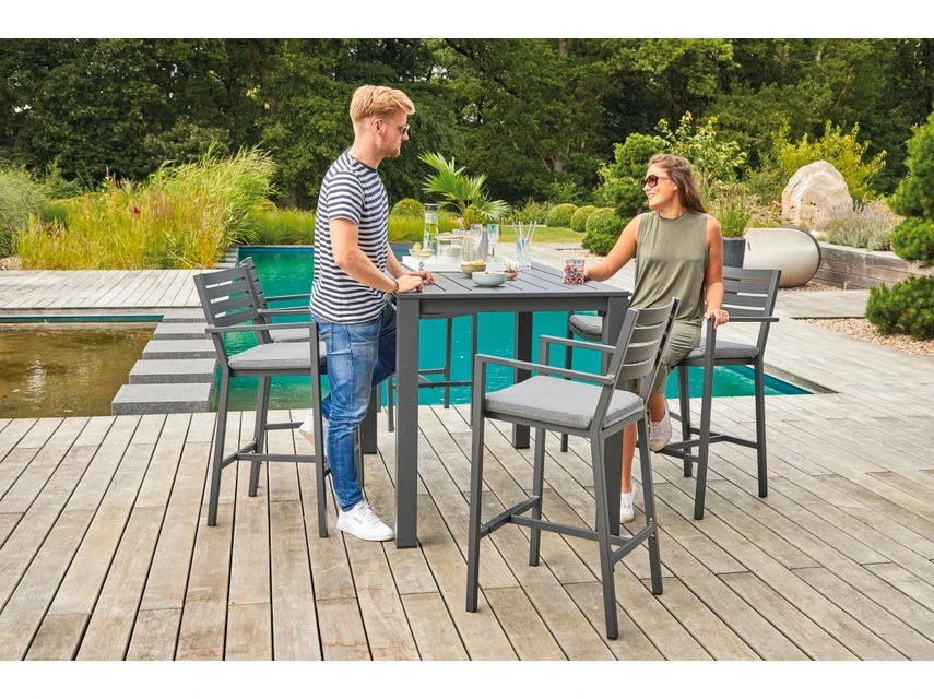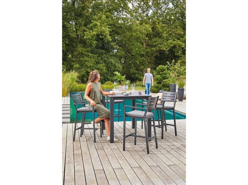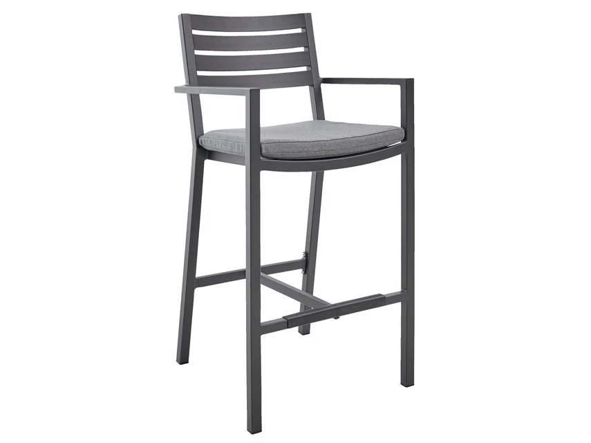 Der Gartenhocker Graciosa verfügt über ein Gestell aus Aluminium anthrazit pulverbeschichtet, was für Stabilität und Langlebigkeit sorgt. Das Sitzkissen Spunpoly in Grau sorgt für Komfort beim Speisen oder Relaxen.