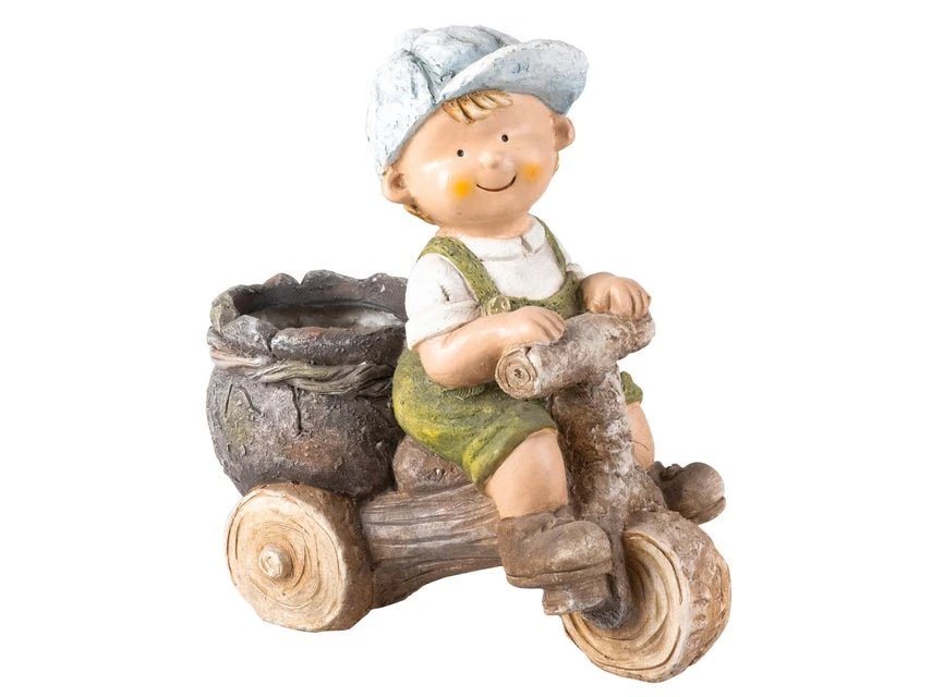 Die niedliche Figur mit fröhlichem Blick ist nicht nur eine reizende Dekoration für den Garten und Balkon. Mit dem Korb auf dem Fahrrad erhält man gleichzeitig auch einen hübschen kleinen Pflanztopf für frisches Grün oder bunte Blümchen. Aus wetterfestem Kunststein ist sie detailreich in harmonischen Farben gestaltet.