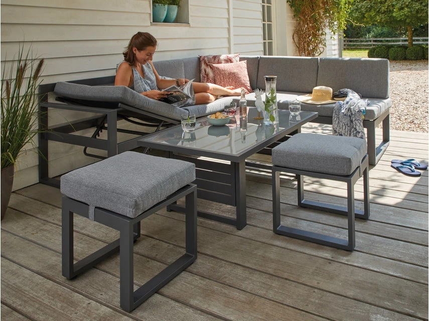 Das moderne Gartenmöbel-Set Lina könnte auch in Ihrem Garten bald ein gemütlicher Treffpunkt für die ganze Familie sein. Zum Set gehören eine 2-teilige Eckbank (213 x 198 cm, NICHT seitenverkehrt montierbar), zwei Hocker (je 39 x 34 x 39 cm) und ein höhenverstellbarer Tisch (120 x 44-67,5 x 65 cm). Bequemen Sitzkomfort bieten die mitgelieferten, weichen Sitz- und Rückenkissen, Armlehnen (Höhe 56 cm) sowie eine Verstellfunktion an der 3-er Bank (Sitzhöhe ohne Kissen 34 cm, mit Kissen 43 cm).