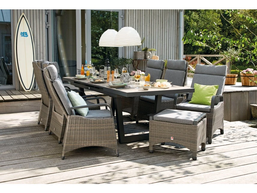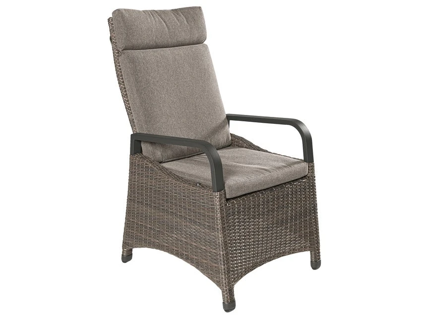 Rasch wird der bequeme Gartenstuhl Komido ein Lieblingsstück für jeden! Das Aluminiumgestell dieses Sessels ist mit grauem Kunststoffgeflecht ummantelt und er ist zusätzlich mit einem praktischen Sitz- und Rückenkissen aus Polyester in grau ausgestattet. Die Rückenlehne kann mittels Gasdruckfeder einfach und unkompliziert verstellt werden.