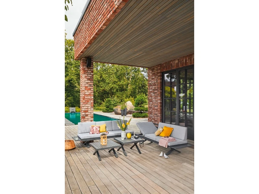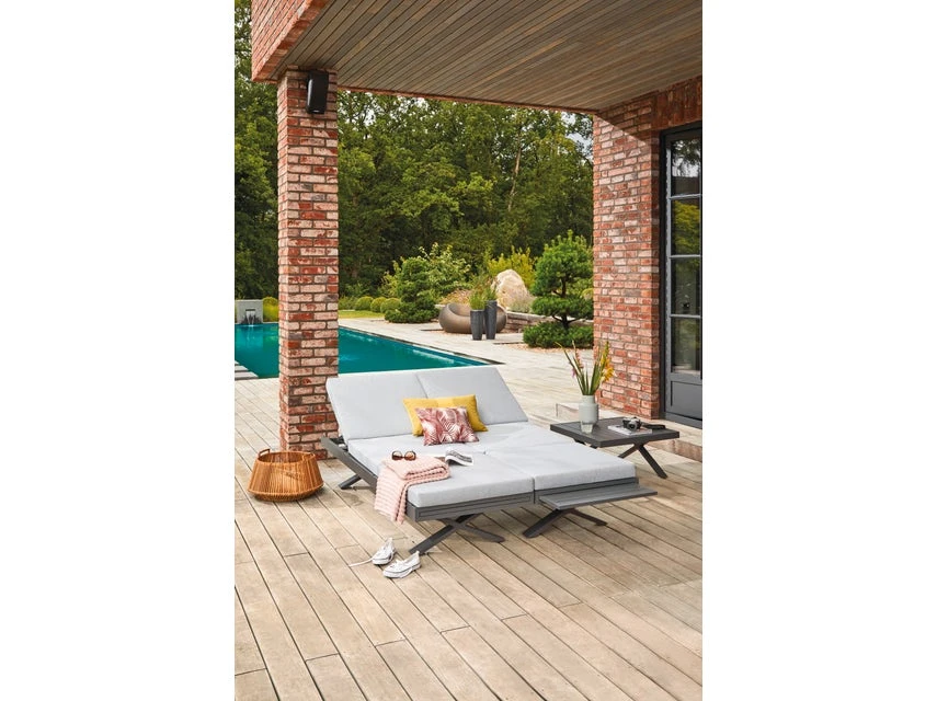 Die Gartenbank bietet eine ausziehbare Ablagefläche aus Stahl links, einen aufstellbaren Kopfteil rechts inkl. 3x Sitzkissen B70xH8xT65 cm und 3x Rückenkissen 65×38 cm.