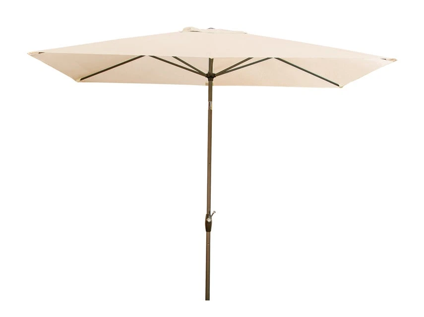 Das moderne Modell besteht aus einem Aluminiumgestell in silber und einem naturfarbenen Schirm aus Polyester mit 6 Stahlschienen.