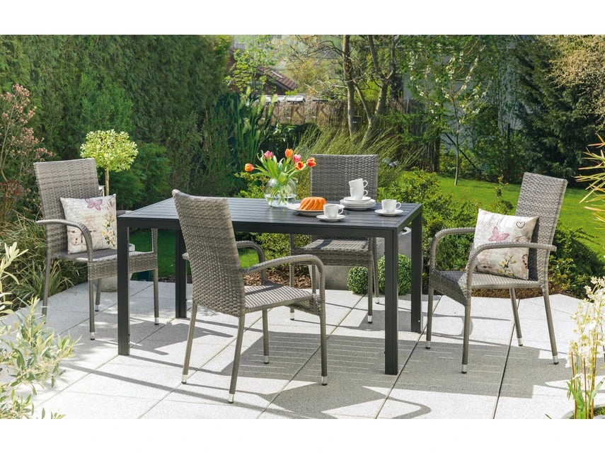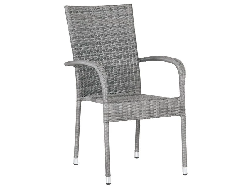 Mit dem Stapelstuhl Tonio erhalten Sie eine komfortable Sitzgelegenheit. Das Stahlgestell dieses Gartensessels ist mit einem Geflecht aus grauem Kunststoff ummantelt und mit angenehmen Armlehnen ausgestattet.