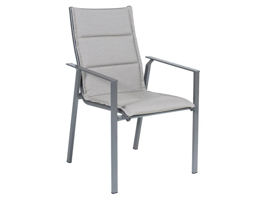 Mit dem Stapelstuhl erhalten Sie eine komfortable Sitzgelegenheit. Das Aluminiumgestell dieses Gartensessels ist mit einem leicht gepolsterten Textilbezug bespannt und mit angenehmen Armlehnen ausgestattet.