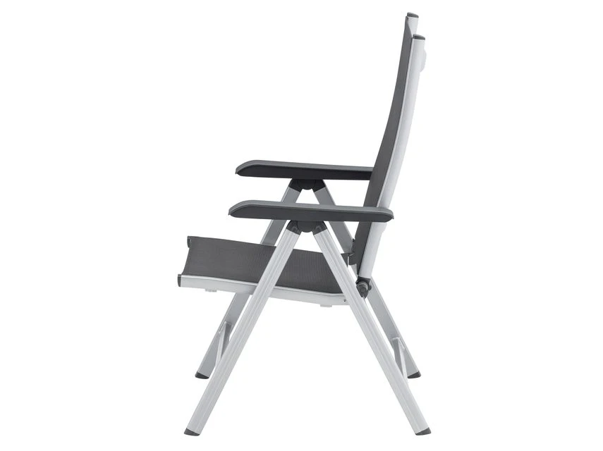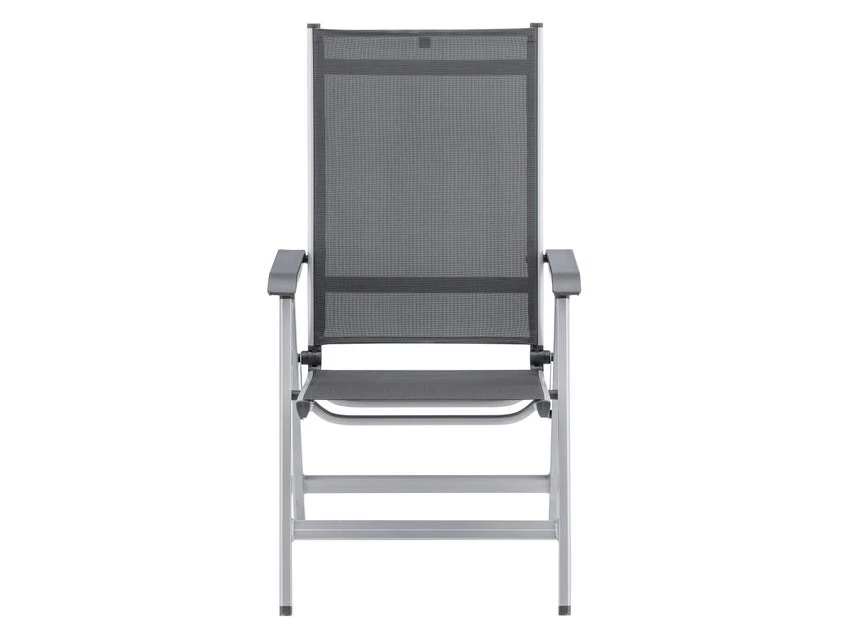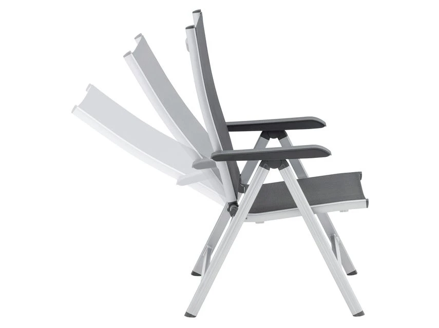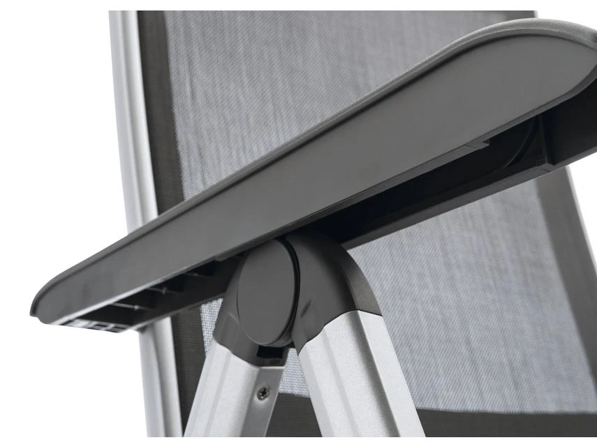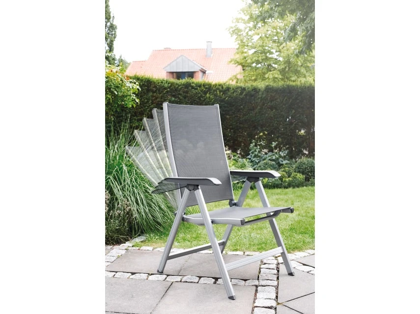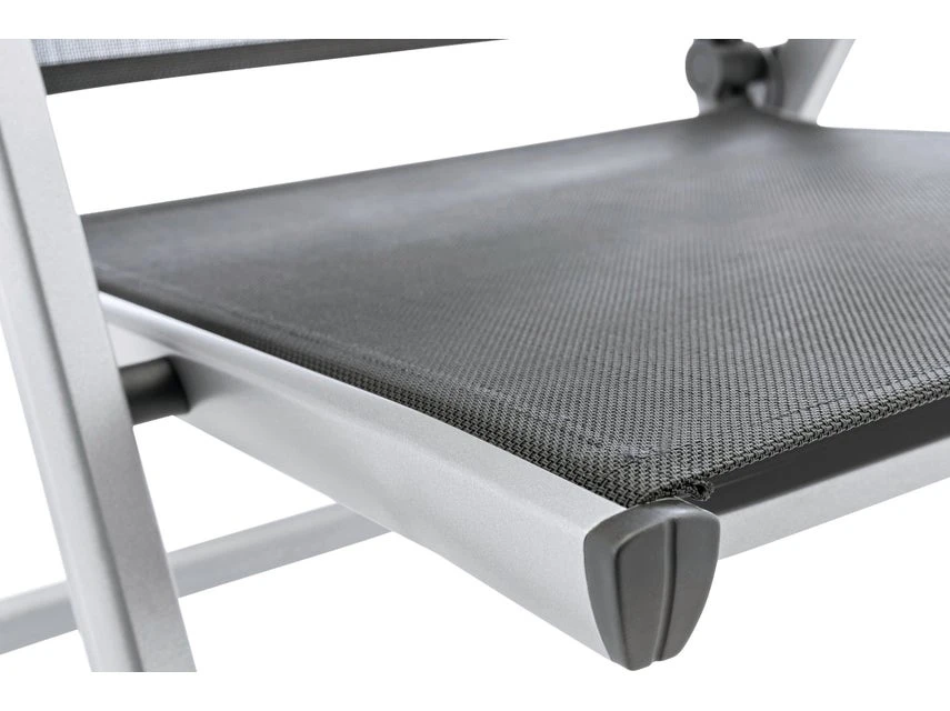 Mittels Rasterschiene lässt sich der Sessel leicht in 4 verschiedene Positionen bringen, so wird der Komfort eines Liegestuhls direkt integriert. Das solide und formschöne Gestell besteht aus edlem, silberfarbenem Aluminium. Die anthrazitfarbene Sitzfläche wird aus wasserdurchlässigem, hochwertigem Outdoorgewebe gefertigt. Die Sitzfläche nimmt kein Wasser auf und trocknet schnell, so können Sie auch nach einem kleinen Regenschauer rasch wieder Platz nehmen. Das luftige Gewebe ist formstabil und trotzdem sehr bequem und zusätzlich UV- und sonnenölbeständig – insgesamt also der perfekte Begleiter in Ihrem Garten. Dank der leichten Materialien und des Klappmechanismus lässt sich der Stuhl leicht zu handhaben – wenn er nicht benötigt wird können Sie ihn platzsparend verstauen.