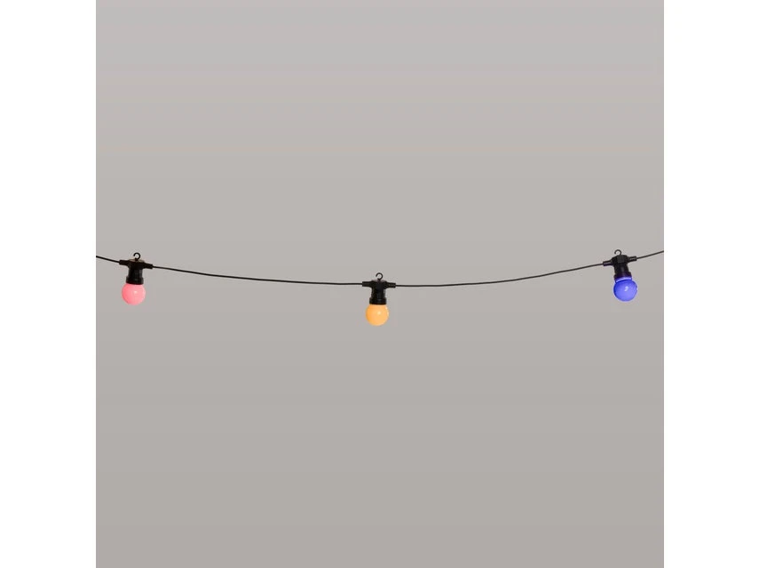 Für stimmungsvolle Abende im Garten, auf dem Balkon und der Terrasse: Die outdoor-taugliche Lichterkette Nirvana von Globo schafft stets die passende Atmosphäre und schmückt auch toll Sträucher oder Bäume. Insgesamt zehn LED-Leuchtkugeln aus opalem Kunststoff sorgen draußen für buntes Licht. Angebracht sind sie im Abstand von 50 cm auf einer 450 cm langen, spritzwassergeschützten Kunststoffkette mit 300 cm langer Zuleitung.