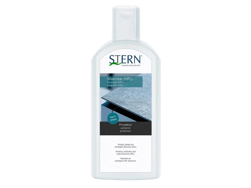 Speziell für strapazierfähige HPL-Möbel (High Pressure Laminate) entwickelt wurde das Pflegemittel Silverstar. Es pflegt, schützt und versiegelt die robusten Oberflächen in einem. Die Anwendung mit dem sehr ergiebigen Mittel mit Nano-Effekt ist kinderleicht: Nach einer gründlichen Reinigung wartet man circa 30 Minuten, danach trägt man den Protektor auf und verteilt ihn gleichmäßig mit einem weichem Tuch. Trocknen lassen, dann eine weitere dünne Schicht auftragen und diese wieder trocknen lassen. Am nächsten Tag wird einfach mit einem Tuch und klarem Wasser nachpoliert – und schon sind Ihre Garten- und Balkonmöbel gegen Flecken, Wind und Wetter geschützt. Je nach Bedarf sollte die Anwendung mindestens zwei Mal jährlich, idealwerweise im Frühjahr und Herbst, erfolgen. So hat man länger Freude an HPL-Möbeln und -Tischplatten.