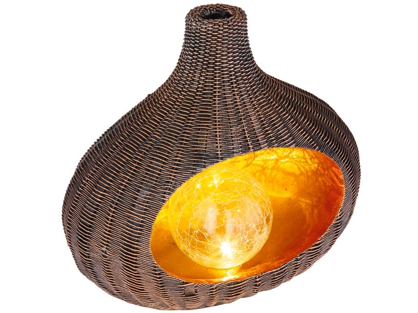 Ein absoluter Hingucker ist diese originell gestaltete Solarleuchte der Marke Globo. Sie ist einer klassischen Korbflasche nachempfunden, die bauchige Form und das typische Weidengeflecht sind aus braunem Kunststoff perfekt nachgebildet. Wie eine Skulptur schmückt sie gemütliche Outdoorbereiche und schafft mit stimmungsvollen Licht ein behagliches Ambiente. Dafür sorgen die goldfarbene Innenfläche, die eine Glasleuchtkugel mit Krakeleemuster effektvoll schimmern lässt. Das enthaltene LED verströmt warmweißes Licht, gespeist wird es aus Sonnenenergie und dem eingebauten Akku der spritzwassergeschützten Leuchte.