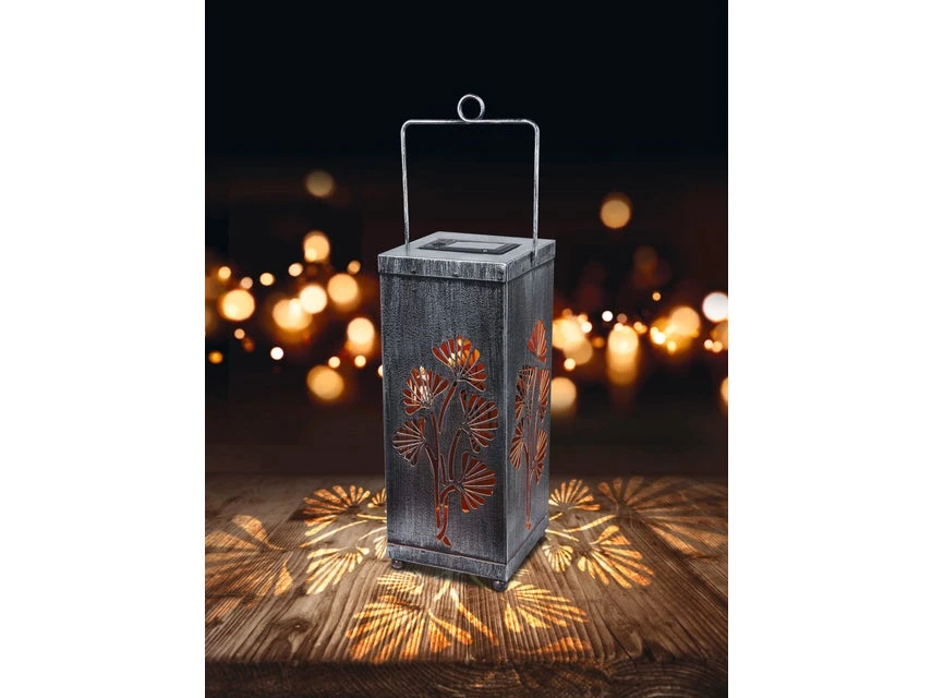 Als Laterne im Retro-Look bezaubert diese hübsche Solarleuchte der Marke Globo. Das ausgestanzte Blumenmuster, das auf allen Seiten des Metallgehäuses in Antiksilberoptik prangt, dient nicht bloß als Zierde. Es schenkt auch einmalige Lichteffekte mit romantischem Flair. Die spritzwassergeschützte Leuchte ist ein tolles Highlight für den Garten, Balkon oder die Terrasse.