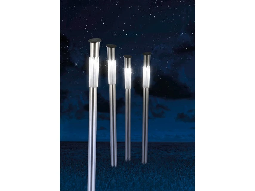Gleich drei auf einen Streich erhält man mit diesem Solarspieß-Set von Globo. Das schlanke, moderne Deisgn macht die 70 cm hohen, aus robustem Edelstahl gefertigten Leuchten zu echten Blickfängen im Garten und an Wegen Dort werden Sie einfach in den Erdboden gesteckt und erhellen mit LED-Lichtspots die Umgebung. Mit der Schutzart IP44 sind sie unempfindlich gegen Spritzwasser und daher sicher im Outdoorbereich verwendbar.