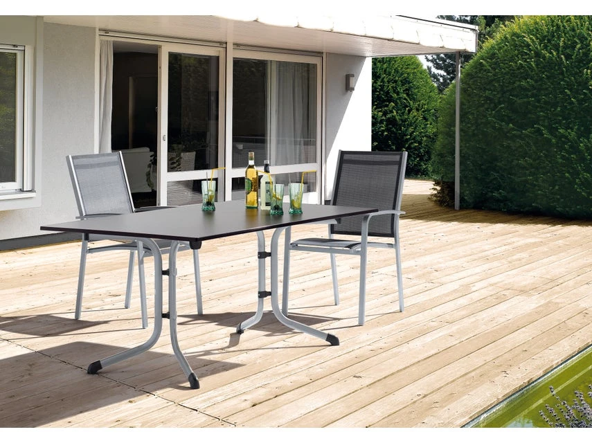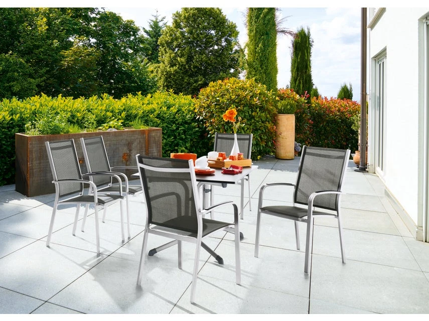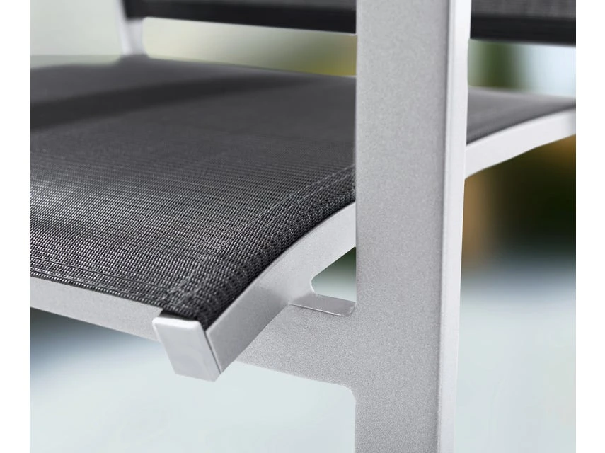 Ansprechend und komfortabel ist der Stapelstuhl Meran! Der Gartensessel aus Aluminium mit Textilbezug und bequemen Armlehnen punktet auch durch die Möglichkeit des Stapelns und verleiht dem Außenbereich ein elegantes Ambiente.