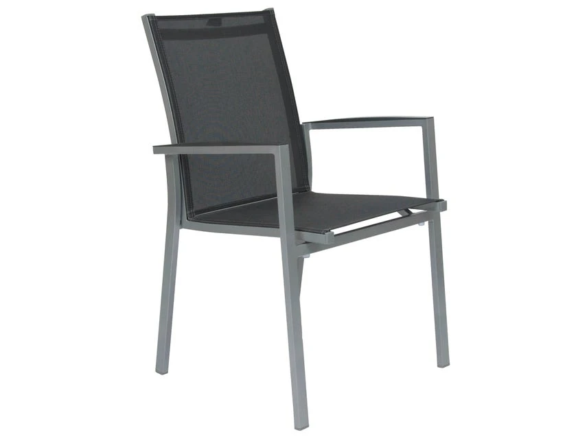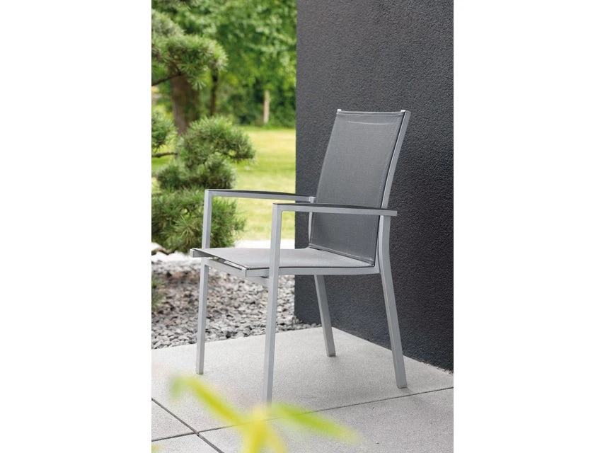 Mit dem Stapelstuhl erhalten Sie eine komfortable Sitzgelegenheit. Das Aluminiumgestell in graphit dieses Gartensessels ist mit einem Textilbezug in silbergrau bespannt und mit angenehmen Armlehnen ausgestattet.
