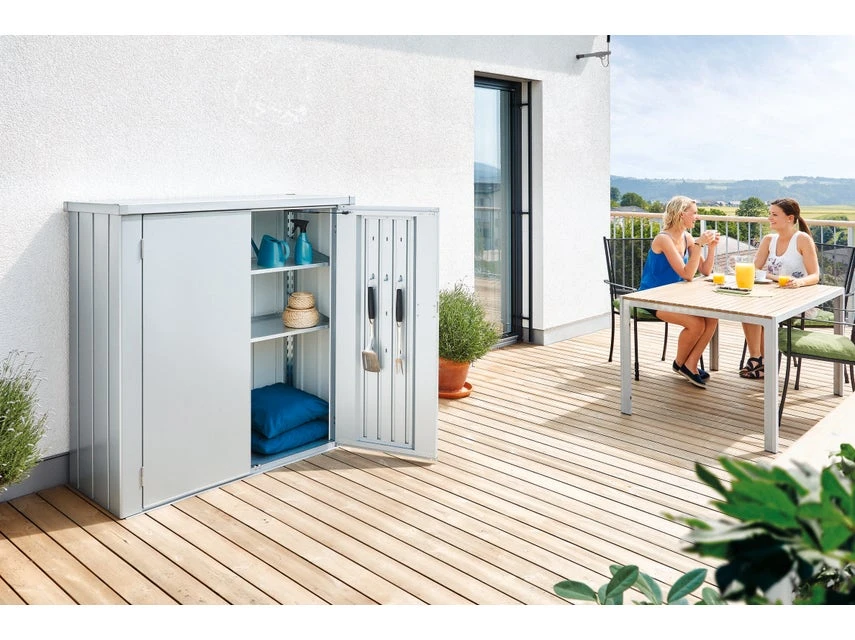 Im Terrassenschrank “Romeo” sind Gartenwerkzeuge, Sitzauflagen & Co. wetterfest untergebracht und stets zur Hand, wenn man sie braucht.